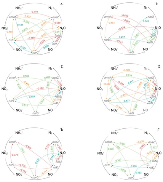 Pearson’s correlations for the detection of time-independent relationships between the recorded gene copy numbers per gram of soil and N2O flux rates of the ridge (0–10cm). Weak (≥0.30; positive blue, negative: organge), moderate (≥0.50, positive green, negative: red) and strong (≥0.75, positive green, negative: red) relationships are shown. (A) ZI-ZN (zero irrigation without (zero) nitrogen (N) fertilizer), (B) ZI-N (zero irrigation with broadcasted nitrogen (N) fertilizer), (C) SI-N (sprinkler irrigation with broadcasted nitrogen (N) fertilizer), (D) DI-N (drip irrigation with broadcasted nitrogen (N) fertilizer), (E) F (fertigation), (F) F-ZC (fertigation without (zero) crops), amoA = gene encoding ammonium monooxygenase, nxrB = gene encoding nitrite oxidoreductase, narG = gene encoding nitrate reductase, nirK/nirS = genes encoding nitrite reductase and nosZ = gene encoding nitrous oxide reductase.