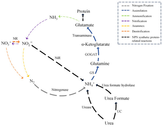 Nitrogen transformation in microorganisms is often described as a cycle consisting of six distinct processes: ammonification, nitrogen fixation, nitrification, denitrification, anaerobic ammonium oxidation (anammox), and assimilation [167]. In this nitrogen cycle network, atmospheric dinitrogen is converted to ammonia by nitrogen-fixing microorganisms, which is then converted to glutamate through assimilation. Microbial ammonification of organic nitrogen decomposes organic nitrogen to release ammonia molecules, which are then oxidized to nitrite and further to nitrate under the nitrification of nitrifying bacteria. Nitrate is then oxidized to atmospheric dinitrogen under anoxic conditions via denitrification, while nitrite is oxidized via anammox and released into the atmosphere. In this cycle, the conversion of NPN into feed proteins is represented by microbial assimilation (Figure 2). The role of NPN in microbial protein synthesis was demonstrated in the 1960s when Belasco and Henderickx showed the high efficiency of ammonium butanedioate in facilitating microbial protein synthesis. Further experiments by Zhu et al. demonstrated that organic ammonium salts can provide nitrogen for bacterial growth and cellulose digestion, while also promoting microbial protein synthesis [168]. A variety of microorganisms in nature can use NPN to synthesize proteins for their growth [169]. Microorganisms use enzymes to degrade NPN into ammonia, which is further assimilated into amino acids under the catalytic effect of enzymes and then metabolized by microorganisms to produce mycoprotein.