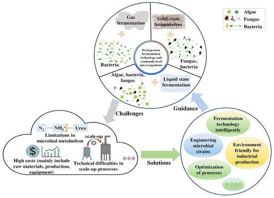 From the viewpoint of technology, the above advancements in various areas could promise to remove relevant obstacles for efficient microbial protein production on a large scale. However, the wide commercial production of microbial protein for animal feed can only be made possible by synergistic efforts regarding safety, regulation, and popular acceptance. Currently, consumer awareness of feed proteins is low, especially due to the lack of understanding of their positive impacts on animal health, growth, and development. In addition, the commercial production of microbial proteins still faces many challenges. Firstly, further investigation is required to explore the implementation of various NPNs and strains for microbial protein production. Meanwhile, it is necessary to manage the synchronous assessment of microbial protein used for feed by evaluating its potential risks and safety. Secondly, with the rapid development and wide application of synthetic biology technology, the genetic modification of microorganisms has become an effective means of enhancing the nitrogen utilization capacity. However, with the strict restrictions of current policies and regulations, the compliance issue of transgenic manipulation of microorganisms has become an important challenge in industrial feed protein production. Improving the policy environment and strengthening compliance management are important ways to comply with regulations for compliant production. Economic efficiency can be enhanced by optimizing raw material selection and energy usage. For example, the reuse of by-products or wastewater can not only reduce energy consumption and environmental pollution but also create additional economic benefits. Based on various optimization strategies, cost reduction can be effectively achieved, and large-scale production can be realized. In any case, technical issues, quality assurance, safety, regulatory, and environmental impact have to be duly addressed to expand the microbial protein in the feed protein market, which will alleviate the shortage of plant-sourced feed protein and avoid the loss and environmental risk of NPN.
