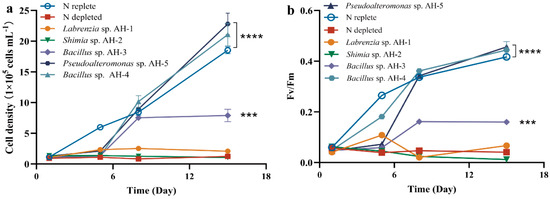 From the initial collection of 42 isolated strains, five distinct species were selected for co-culture experiments: Labrenzia sp. AH-1, Shimia sp. AH-2, Bacillus sp. AH-3, Bacillus sp. AH-4, and Pseudoalteromonas sp. AH-5. AG11 was co-cultivated with five bacterial strains individually in a synthetic L1 medium, lacking inorganic nitrogen, ensuring that Symbiodiniaceae growth relied on bacteria-released organic molecules. The growth effect on AG11 significantly varied depending on the bacterial strain. No growth enhancement was found when AG11 was co-cultured with Labrenzia sp. AH-1 and Shimia sp. AH-2, which is consistent with nitrogen restriction. However, AG11 cell numbers increased over time when co-cultured with Pseudoalteromonas sp. AH-5 and Bacillus sp. AH-4, both of which significantly increased the specific growth rate of AG11 by 13.77–23.11% compared with the medium under N depleted condition. This suggests that these bacteria somehow modulate AG11 growth (Figure 1a). Meanwhile, Bacillus sp. AH-3 had a relatively weak effect on the promotion of cell density growth compared with Bacillus sp. AH-4 (Figure 1a). The Fv/Fm of AG11 showed a similar trend to cell density (Figure 1b).