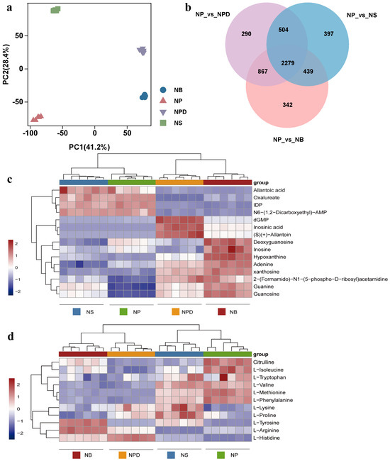 Principal component analysis (a), Venn diagram (b) and heatmaps of metabolites related to specific metabolic pathways. (c) Purine metabolic pathway. (d) Amino acid metabolic pathway. The ordinate represents key differentially expressed metabolites; the abscissa represents different processing conditions (fold change > 1, p < 0.05, and VIP > 1).
