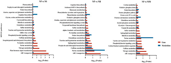 Nucleotides, nucleic acid hydrolysates, were up-regulated in NPD and NB groups: inosine monophosphate (IMP), 2′-deoxyguanosine5′-monophosphate (dGMP), guanosine, guanine, xanthosine, and hypoxanthine (Figure 3c). These metabolites participated in the purine metabolism pathway. Adenine and dGMP showed significant down-regulation under N stress. Compared with the NP group, inosine increased in the NB group but showed a down-regulated trend in the NPD group. Inosine 5′-diphosphate (IDP), deoxyguanosine, and adenylosuccinate displayed an overall down-regulation in NPD and NB groups (Figure 3c). Although guanosine and guanine accumulate more in NS than in NP, their accumulation was relatively smaller compared with NB and NPD.