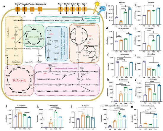 Under N stress, L-histidine and L-tyrosine were significantly up-regulated in NS, NPD, and NB compared with NP (Figure 3d). Concurrently, L-histidine exhibited significant enrichment in NB and NPD compared with NS, while L-tyrosine enrichment was exclusive to NB. In addition, nine amino acids and their derivatives were identified. L-phenylalanine, citrulline, L-methionine, and L-isoleucine showed a downward trend in NS, NPD, and NB, while L-valine was down-regulated in NB and NPD (Figure 3d). L-arginine was down-regulated in NS but up-regulated in NPD and NB compared with NP. L-proline was exclusively enriched in NS, with consistent concentrations in the remaining groups. L-lysine was enriched in NPD and NS, with no changes in the other groups. L-tryptophan concentrations remained consistent across all four groups. Overall, NP vs. NS, NP vs. NPD, and NP vs. NB showed a decreasing trend in amino acid accumulation, indicating preferential intracellular amino acid degradation by cells as an adaptive response to inorganic N deficiency, aiding their environmental adaptability.