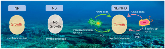 Symbiodiniaceae–bacteria interactions are complex, involving various molecular signals, metabolites, transporters, and molecules whose functions remain under-explored [30,33]. In our study, we tested 5 coral-associated bacterial strains in a N-limited medium; 3 of them did not exhibit any positive effects on Symbiodiniaceae cell cultures. Although the remaining two strains, Pseudoalteromonas AH05 and Bacillus AH01, demonstrated enhancement of the algal growth, the former seemed to be more effective than the latter. Recent studies have shown high host specificity among bacterial communities associated with Symbiodiniaceae, with bacterial species and strains performing similar metabolic functions colonizing similar algal taxa [34]. This aligns with our findings of different cultivation results depending on the strains of Symbiodiniaceae used.
