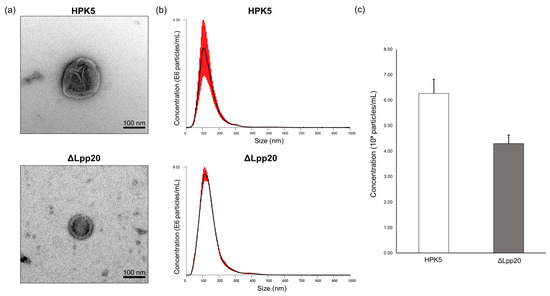 We performed transmission electron microscopy (TEM) and nanoparticle tracking analysis (NTA) according to the ISEV’s recommended methods [18] to identify bEVs in the prepared samples. TEM analysis was performed by JEOL JEM-1400Flash electron microscopy at 100 kV at the Hanaichi UltraStructure Research Institute (Japan; https://www.kenbikyo.com/ (accessed on 17 February 2025)). Briefly, a droplet of prepared sample was placed on a carbon-film grid for 10 s. Staining solution, 2% uranyl acetate in water, was added to the grid and allowed to stain for 10 s, then the dried grid was subjected to electron microscopic observation with negative staining. NTA was performed using a NanoSight analyzer by Fujifilm Wako (Japan; https://labchem-wako.fujifilm.com/jp/custom_service/products/95163.html (accessed on 6 March 2025)). Briefly, bEV samples prepared from the strains HPK5 and HPK5ΔLpp20 were diluted in ultrapure water (Milli-Q, Merck, Darmstadt, Germany), and Mili-Q water was used as a blank. NTA was performed in five 60 s reads. The average of the five reads was calculated and plotted as particle size versus number of particles per milliliter. The recordings were processed by NTA 2.3 build 0033 software using a detection threshold of 8.