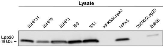 Analysis of Lpp20 in cell lysates from seven clinical H. pylori strains and two lpp20-disrupted strains (HPK5ΔLpp20 and 26695ΔLpp20). By immunoblotting (IB) with an anti-Lpp20 antibody, Lpp20 was detected in all seven H. pylori lysates (JSHR31, JSHR6, JSHR3, J99, SS1, HPK5, and 26695). Lpp20 was not detected in two lpp20-disrupted strains (HPK5ΔLpp20 and 26695ΔLpp20).