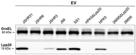 Next, bEV suspensions without IP were subjected to IB with an anti-Lpp20 antibody. bEVs containing Lpp20 were detected from five strains (J99, SS1, HPK5, JSHR3, and JSHR31), but not from the strains 26695 or JSHR6 (Figure 3).