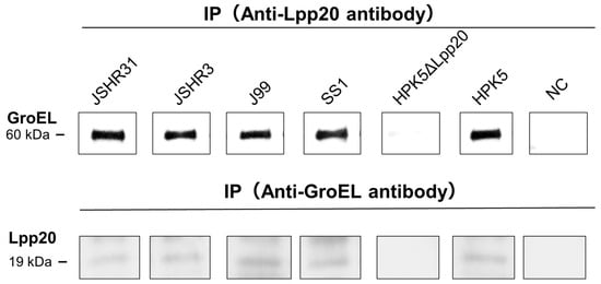 We performed IP–IB analysis to confirm the bEVs containing Lpp20 released from H. pylori clinical strains J99, SS1, HPK5, JSHR3, and JSHR31. IP (anti-Lpp20 antibody)–IB (anti-GroEL antibody) analysis enabled detection of bEVs from the five strains (Figure 4). Next, we performed IP (anti-GroEL antibody)–IB (anti-Lpp20 antibody) analysis to confirm the presence of Lpp20 in the bEVs from these five strains. Lpp20 was not detected in bEVs from the strain HPK5ΔLpp20, in which the lpp20 gene was disrupted (Figure 4). These data are consistent with the results obtained using bEV suspensions without IP (Section 3.2). The bEVs contained surface-localized Lpp20; this protein may also be contained within bEVs.