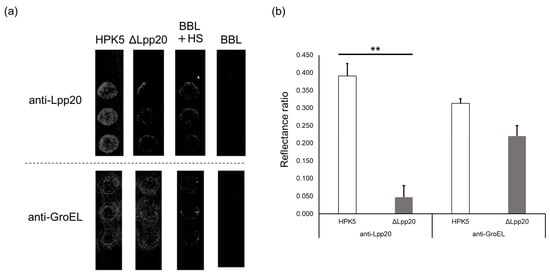 In SPRi analysis with an anti-Lpp20 antibody, significantly more spots were detected for bEVs of the strain HPK5 than for the strain HPK5ΔLpp20 (p < 0.01). Minor signals were observed in a BBL medium including 10% HS (BBL + HS, no bacteria), which was used as the blank (Figure 5a); thus, the results were adjusted on the basis of the reflectivity of the blank to evaluate the binding interactions of bEVs (Figure 5b). No signal was observed in the BBL medium.