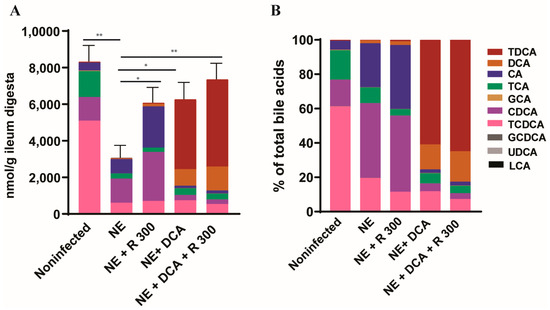 - Bansal, M.; Alenezi, T.; Fu, Y.; Almansour, A.; Wang, H.; Gupta, A.; Liyanage, R.; Graham, D.B.; Hargis, B.M.; Sun, X. Specific Secondary Bile Acids Control Chicken Necrotic Enteritis. Pathogens 2021, 10, 1041. [Google Scholar] [CrossRef]