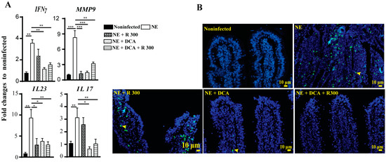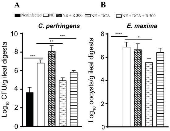 3.4. DCA Reduced C. perfringens and E. maxima Colonization in Ileum