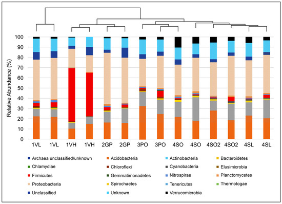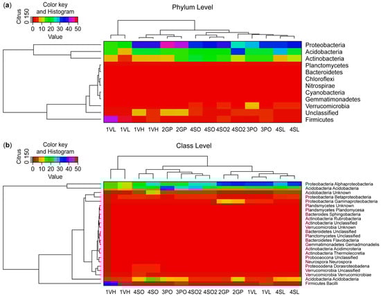 A total of seventeen known and three unclassified bacteria phyla were identified in this study. Heat maps and tree diagrams are provided in Figure 2, showing (a) the relative abundance of 12 top 16S bacterial phyla seen under the rhizosphere of the different Citrus plant types and (b) the relative abundance of the 24 top 16S bacterial classes seen under the rhizosphere of the different Citrus plant types. Percentages of total phylum reads by sample site are shown in Figure 3. The top phylum observed in the rhizosphere of all sample plant types was the Proteobacteria, which amounted to 63,791 reads (32.7% of total sequences obtained). By contrast, in the West Valencia rhizosphere (highly symptomatic), the phylum Firmicutes was the most prevalent, accounting for 74% of its total reads. The Acidobacteria and Actinobacteria registered 39,192 (20%) and 23,525 (12%) reads, respectively, in all plant types. Firmicutes and Verrucomicrobia rounded out the top five with 15,295 (7.8%) and 6218 (3.2%) reads, respectively, in all plant types.