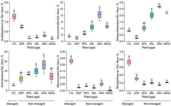 One-way ANOVA analysis of the relative abundance of key bacterial taxa under the rhizospheres of each Citrus plant type. p-values represent any significant differences in the relative abundance under the Valencia rhizosphere (managed) compared with the other Citrus plants (non-managed), confirmed by the Tukey HSD post hoc test, numbers with same letter are not significantly different.