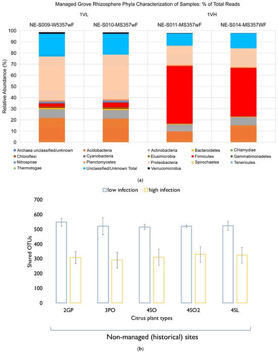 (a) Rhizosphere bacterial community structure of Valencia with high- and low-level infection in the managed grove. (b) Number of shared citrus rhizosphere bacterial OTUs between the non-managed historical sites and the managed sites (low + high infection): 2GP—Site 2 grapefruit, 3PO—Site 3 pineapple orange, 4SO—Site 4 sour orange, 4SO2—Site 4 sour orange, 4SL—Site 4 sour lemon.