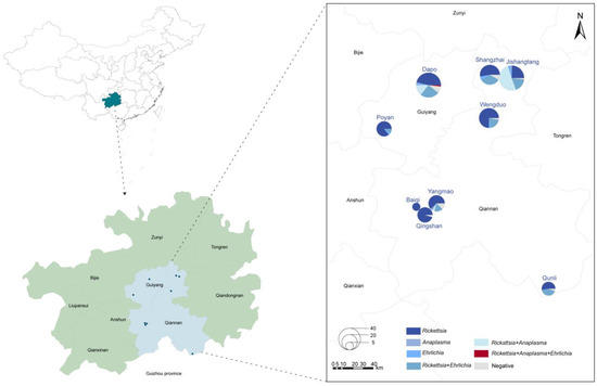 - Lu, M.; Meng, C.; Gao, X.; Sun, Y.; Zhang, J.; Tang, G.; Li, Y.; Li, M.; Zhou, G.; Wang, W.; et al. Diversity of Rickettsiales in Rhipicephalus microplus ticks collected in domestic ruminants in Guizhou Province, China. Pathogens 2022, 11, 1108. [Google Scholar] [CrossRef]