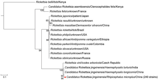 The phylogenetic tree of Rickettsia was constructed based on concatenated ompA, gltA, and 17 kDa nucleotide sequences using the maximum likelihood (ML) method with 1000 bootstrap replicates. The red dots indicate the evolutionary positions of samples that tested positive for all three gene fragments.