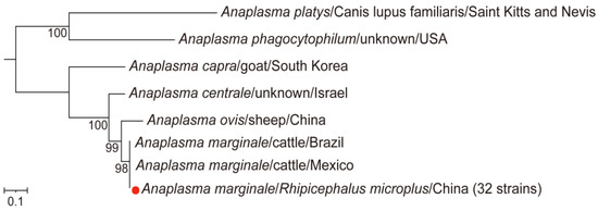 For Anaplasma, a total of 42 samples tested positive for the gltA, groEL, and msp4 gene fragments. The gltA gene sequences from the 42 positive samples were identical and showed 100% identity with Anaplasma marginale (A. marginale) detected in R. microplus from Colombia (GenBank accession number: MT722102.1) [26] (Figure S2A). The groEL gene sequences from 32 of the positive samples displayed 100% identity and grouped with A. marginale detected in Bos taurus in Brazil (GenBank accession number: CP023730.1), while the remaining 10 sequences were identical and clustered with A. marginale from R. microplus in China (GenBank accession number: KX987395.1) [27] (Figure S2B). The msp4 gene sequences exhibited 99.8–100% identity and clustered phylogenetically with A. marginale strains from cattle in Malaysia (GenBank accession number: MT173810.1) and Brazil (GenBank accession number: MK570464.1) [28] (Figure S2C). Phylogenetic analysis further confirmed that the species identified in this study was A. marginale (Figure 3), with an overall positivity rate of 15.3% (95% CI: 11.5–20.1). The positivity rate was significantly higher in male ticks compared to female ticks (36.5% vs. 7.5%, p < 0.001) and notably lower in blood-feeding ticks compared to host-questing ticks (7.7% vs. 30.8%, p < 0.001).