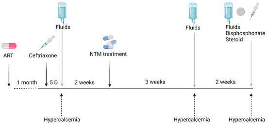 The first pathway involves immune suppression, as seen in untreated HIV patients. During this period, NTM spreads within the patient. When the immune system begins to recover, either through ART therapy in previously untreated HIV patients and the initiation of NTM treatment or following the reduction or discontinuation of immunosuppressive drugs [18,22], the large number of atypical Mycobacteria, combined with the rapid restoration of immune function, facilitates granuloma formation and substantial production of 1,25(OH)2D [6]. This typically results in hypercalcemia within a short timeframe, usually around four weeks.