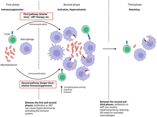 The current study hypothesizes that the pathophysiology of hypercalcemia development in immunosuppressed patients infected with NTM consists of three key phases (Figure 3). In the first phase, there is complete immune suppression. The second phase, characterized by the onset of hypercalcemia, occurs when the immune system is no longer suppressed, leading to macrophage activation and significant production of 1,25(OH)2D.