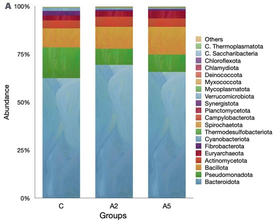 Effect of biowaste of Padina gymnospora supplementation on rumen metagenome at three different taxonomic ranks: (A) at the phylum level, (B) at the order level, and (C) at the genus level. The top 20 phyla and orders are visualized in panels (A) and (B), respectively, whereas the top 25 genera are visualized in panel (C). C—control without biowaste supplementation; A2—test treatment I with 2% biowaste of Padina gymnospora; A5—test treatment II with the biowaste of Padina gymnospora inclusion at 5% level.