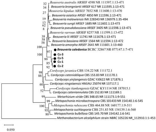 The fragments of the PCR amplification products of the rDNA-ITS from the four strains were determined. The sequences were 196 bp. The phylogenetic tree was constructed using the neighbor-joining method with the Methanobacterium alcaliphilum strain NBRC 105226 NR_112910.1:1-453 as the reference bacterium. Figure 3 shows the evolutionary tree. The comparison results showed that the isolates were 99.35%, 99.36%, 99.45%, and 99.78%, similar to Bc BCRC 32867 NR 077147.1 (accession no. NR 077147.1), respectively. Consequently, the combined morphological analysis and rDNA-ITS sequence similarity analysis identified the strain as B. caledonica.