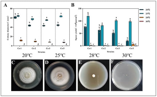 Effect of temperature on the growth of B. caledonica: (A) diameter of four strains after 18 d at different temperatures; (B) spore production of four strains after 18 d at different temperatures; (C–F) colony diagrams of strains after 18 d at different temperatures. Different lowercase letters indicate significant differences at the 0.05 level, according to Duncan’s test. The white dots in the figure represent the actual measured values.