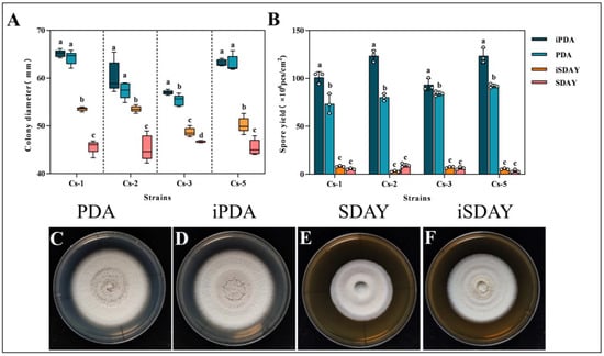 Effect of medium on the growth of B. caledonica: (A) diameter of 4 strains after 18 d under different medium conditions; (B) spore production of 4 strains after 18 d under different medium conditions; (C–F) colony diagrams of the strains after 18 d under different medium conditions. Different lowercase letters indicate significant differences at the 0.05 level, according to Duncan’s test. The white dots in the figure represent the actual measured values.