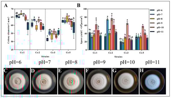 Effect of pH on the growth of B. caledonica: (A) diameter of the four strains after 18 d at different pH conditions; (B) spore production of the four strains after 18 d at different pH conditions; (C–H) colony diagrams of the strains after 18 d at different pH conditions. Different lowercase letters indicate significant differences at the 0.05 level, according to Duncan’s test. The white dots in the figure represent the actual measured values.