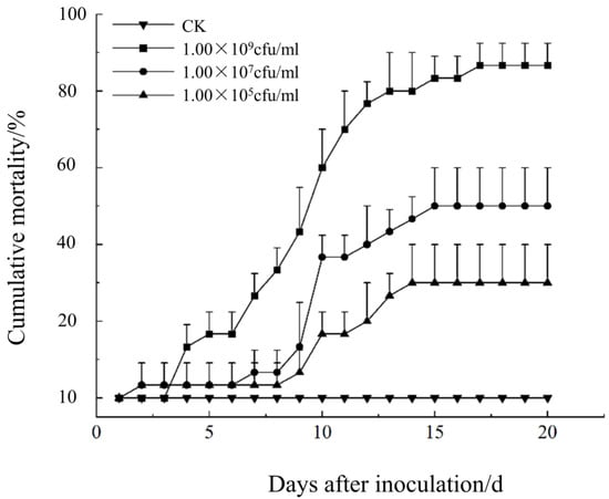 Regarding the influence of different inoculation concentrations of the Cs-1 strain on pathogenicity, the results showed that the cumulative mortality of BPWs increased with an increasing spore concentration of Bc and treatment time. The highest values of cumulative mortality were reached 20 d after inoculation at concentrations of 1.00 × 109, 1.00 × 107, and 1.00× 105 cfu/mL. The highest cumulative mortality of BPWs was recorded at the highest concentration (1.00 × 109 cfu/mL) treatment, with a mortality rate of 86 67% (Figure 8).