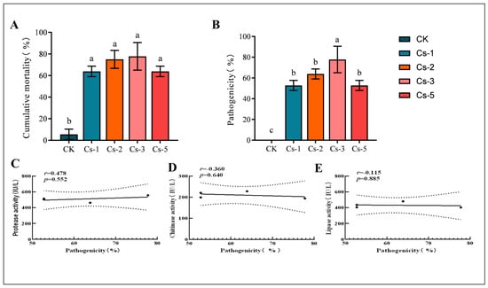 Enzyme activity and virulence of 4 strains of B. caledonica: (A) graph of cumulative mortality of the 4 strains; (B) graph of virulence of the 4 strains; (C) correlation of protease with virulence; (D) correlation of chitinase with virulence; (E) correlation of lipase with virulence. Different lowercase letters indicate significant differences at the 0.05 level, according to Duncan’s test. (C–E) Each point represents a set of data on pathogenicity and the corresponding enzyme activity. The lines represent the fitting relationships between variables.