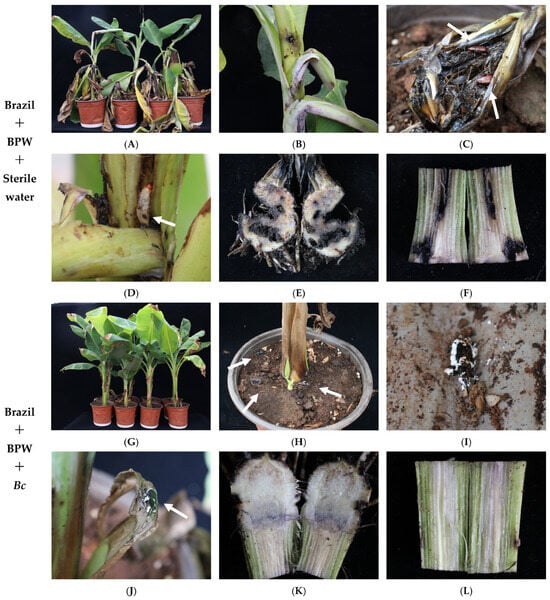 Interaction between B. caledonica, O. longicollis (Oliver), and banana plantlets: (A) Overall picture of banana plantlets in the CK group; (B) infestation symptoms in the CK group; (C) O. longicollis (Oliver) in the plant pseudostem in the CK group. The arrow indicates the adult of O. longicollis (Oliver); (D) larvae produced after 35 d in the CK group. The arrow indicates the larva of O. longicollis (Oliver); (E) infestation symptoms in the bulb of banana plantlets in the CK group; (F) infestation symptoms in the pseudostem of banana plantlets in the CK group; (G) overall picture of banana plantlets in the treatment group; (H) infestation symptoms in the treatment group. The arrow indicates the diseased insect; (I) O. longicollis (Oliver) onset in the soil to form stipe in the treatment group; (J) O. longicollis (Oliver) onset on plant to form stipe in the treatment group. The arrow indicates the diseased insect; (K) banana plantlet bulb in the treatment group; (L) banana plantlet pseudostem in the treatment group.