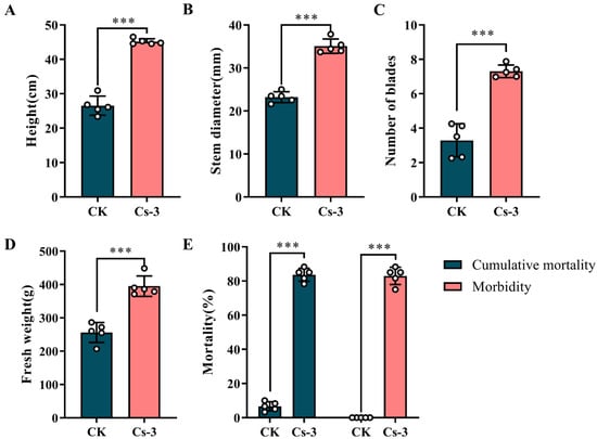 Bc has high pathogenicity against BPWs in the laboratory. To validate the laboratory results, the present study added a greenhouse pot experiment to evaluate the biocontrol efficacy of Bc against BPWs, utilizing banana plants that were one year old as the host. The plants infested with BPWs were treated with Bc. Two treatments were established: (1) the control (CK group), where BPW adults were introduced into banana plantlets without prior inoculation of Bc, and (2) the treatment (Cs-3 group), where BPW adults inoculated with Bc in advance were introduced into banana plantlets. The inoculum concentration of Bc was 1.00 × 108 cfu/mL, while sterile water was used to replace the spore suspension in the control group. Each treatment was replicated five times, with eight banana plants placed in each insecticidal cage (L: 100 cm; W: 100 cm; H: 100 cm) as one replicate. A total of 60 adult BPWs were introduced into each cage, totaling 80 banana plants and 600 BPWs. The specific inoculation method was the same as that described in Section 2.6.2 above; all the treated banana plantlets were cultured and monitored in the greenhouse of the Yunnan Academy of Agricultural Sciences.