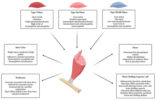 The primary components of skeletal muscle are fibers with specific metabolic and morphological characteristics, classified according to various criteria. For instance, muscles are categorized by contraction speed into fast twitch and slow twitch fibers. Alternatively, fibers can be classified based on their metabolic properties into oxidative and glycolytic fibers. In general, three main types are recognized: Type I, or slow-twitch oxidative fibers; type IIA, or fast-twitch oxidative fibers; and types IIX and IIB, or fast-twitch glycolytic fibers. Slow-twitch fibers are associated with myosin heavy chain I (MyHC I) isoforms, which exhibit lower ATPase activity and shorter lever arms compared to Myosin Heavy Chain II (MyHC II) isoforms found in fast-twitch fibers [5,6]. The arrangement of different muscle fibers, including their type, size, quantity, and intramuscular fat content, influences meat quality [4]. Meat quality refers to the attributes that determine its value and marketability. Key characteristics associated with meat quality include color, pH, texture, flavor, and water-holding capacity [3] (Figure 1). For example, the concentration of hemoglobin and myoglobin found in muscle fibers determines meat color. Oxidative fibers, which have higher levels of these proteins, appear bright red. In contrast, glycolytic fibers, with lower myoglobin concentrations, have a pale color [5]. Meat color indicates muscle fiber types, influencing texture, flavor, and overall eating experience, and it is also associated with consumer perception and buying decisions, with bright meat considered fresh and high-quality [87]. Significantly low pH levels negatively affect muscle protein stability, leading to a loss of bright color, resulting in a paler appearance, reduced water retention capacity, and a soft texture [8].