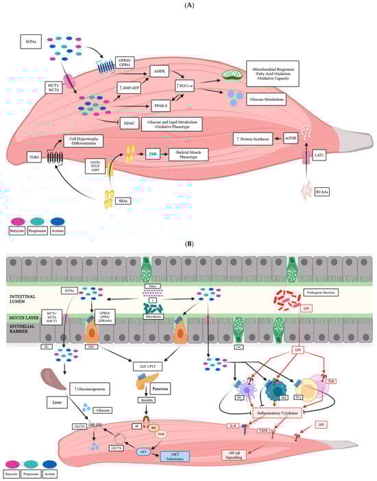 Short-chain fatty acids are absorbed by specialized transporters and recognized by various receptors expressed in adipose tissue, neurons, immune cells, heart, and skeletal muscle [38,39,40,41,42]. Signaling through these receptors can ultimately modify gene expression via intracellular messengers [43,44,45]. SCFAs can interact with deacetylases and acetyl transferases, promoting gene transcription [46,47,48] while also being utilized as a substrate for β-oxidation in the mitochondria [49]. The presence of these metabolites is known to contribute to the formation of oxidative fibers [50]. Furthermore, SCFAs have been observed to indirectly affect skeletal muscle. These metabolites stimulate the secretion of hormones by enteroendocrine cells, which are associated not only with glucose absorption and metabolism but also with enhanced recruitment of skeletal muscle microvasculature [51]. Compounds released from the metabolism of bile acids and amino acids can also impact muscle metabolism [52]. Secondary bile salts, for instance, can activate cellular receptors involved in cell growth and differentiation and turn on genes associated with skeletal muscle phenotype [53]. Similarly, branched-chain amino acids (BCAAs) can serve not only as nutrients but also as signaling molecules that influence skeletal muscle development [54,55,56]. Probiotics and probiotic-derived metabolites are known for their immunomodulatory properties, particularly their ability to downregulate the expression of inflammatory cytokines. This could potentially mitigate the harmful effects of inflammation on skeletal muscle [57,58] as it has been linked to alterations in muscle protein balance and mitochondrial metabolism, leading to atrophy [59].