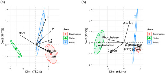 Principal component analysis (PCA) to detect the correlation between physical–chemical variables and soil enzymes among cover crop area, native Cerrado, and potato cultivation. (a) PCA considering micro-macronutrient contents and pH; (b) PCA considering soil enzymes, carbon, moisture, and pH. Dim 1 (PC1) and Dim 2 (PC2) represent the x and y axes, respectively. Ellipses show replicates per area. Each color corresponds to an area. The length of the arrows represents the strength of association of the respective soil properties with the respective areas. The angle between the vectors indicates the degree of their relationship (smaller angle means high correlation). Al: Aluminum; Ca: Calcium; K: Potassium; Mg: Magnesium; P: Phosphorus; Zn: Zinc; Figure created by R software version 4.1.1. using the “ggplot2” package.