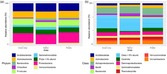 Relative abundance of the soil bacterial community in a cover crops area, native Cerrado, and potato cultivation. (a) Relative abundance at the phylum (a) and class (b) level.