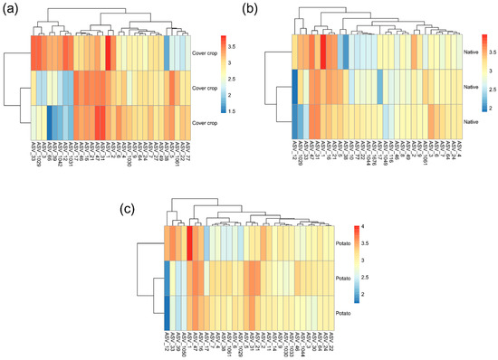 Heatmap representing the relative abundance of the 30 most abundant ASVs in the native Cerrado cover crop and potato cultivation areas. (a) Cover crops; (b) native; (c) potato. The lines are the sampling effort (n = 3). The columns show the 30 most abundant ASVs. The colors represent the relative abundance of each ASV: the redder the bar, the greater the abundance; the bluer it is, the lower the abundance. To facilitate data visualization, the number of reads, which is equivalent to abundance, was represented on a logarithmic scale + 1. The dendrograms show the grouping of ASVs (columns) and samples (rows) based on Euclidean distance. The figures were plotted using the “pheatmap” package implemented by the R software version 4.3.0.