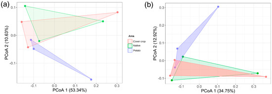 Analysis of principal coordinates (PCoA) based on the Bray–Curtis and Jaccard distance matrices of the soil bacterial community among cover crop, native Cerrado, and potato cultivation areas. In (a) PCoA based on the Bray–Curtis distance matrix; in (b) PCoA based on the Jaccard distance matrix. The percentage of variation explained by the plotted main coordinates is indicated on the X and Y axes. Colored polygons indicate the clustering of bacterial communities between areas.