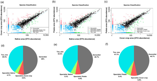 Multinomial species classification method (CLAMtest) categorizing soil bacterial ASV among cover crop, native, and potato cultivation areas. The ASVs were classified into four categories: specialists in area x (cover crop, native Cerrado, and potato crop), generalists, too rare to be classified, and specialists in y (cover crop, native Cerrado, and potato crop). (a) cover crop area x native area; (b) potato area x native area; (c) potato area x cover crop area; (d) native area x cover crop area; (e) native area x Potato area; (f) potato area x cover crop area.