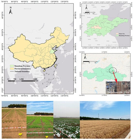 The soil type used in the experiment was Haplustalfs, according to the soil taxonomy of the USA [], and the wheat variety was Jimai 22. The experimental site was located at the Taian Base Experimental Field (Taian, China, 36.10° N, 117.22° E), covering an area of approximately 4000 m2 (Figure 1). Based on Köppen climate classification, the region belongs to the Cwa category. The annual average temperature is 14 °C, with the highest temperature in July averaging 26.4 °C and the lowest in January averaging −2.6 °C. The annual average precipitation is 697 millimeters.