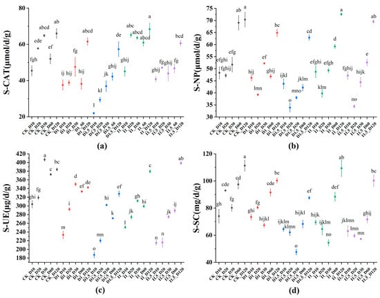 Contents of catalase (a), neutral phosphatase (b), urease (c), and sucrose enzyme (d) in the soil of each group. S-CAT refers to soil catalase activity, S-NP refers to soil neutral phosphatase activity, S-UE refers to soil urease activity, and S-SC refers to soil sucrose activity. Different lowercase letters represent a significant difference at p < 0.05.