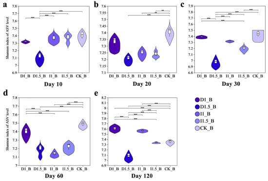 Bacterial Shannon index in wheat rhizosphere soil under treatment with different seed-coating agents at different time points: (a) day 10, (b) day 20, (c) day 30, (d) day 60, and (e) day 120. ** indicates 0.001 < p ≤ 0.01, and *** indicates p ≤ 0.001. The uppercase letter ‘B’ represents bacteria throughout the manuscript.