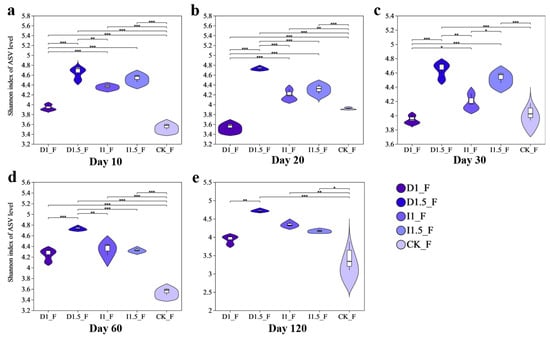 Fungal Shannon index in wheat rhizosphere soil under treatments with different seed-coating agents at different time points: (a) day 10, (b) day 20, (c) day 30, (d) day 60, and (e) day 120. * indicates 0.01 < p ≤ 0.05, ** indicates 0.001 < p ≤ 0.01, and *** indicates p ≤ 0.001. The uppercase letter ‘F’ represents fungi throughout the manuscript.