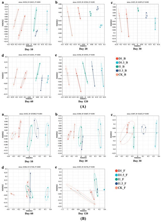 Non-metric multidimensional scaling analysis of bacterial (A) and fungal (B) communities under treatment with different single seed-coating agents: (a) day 10, (b) day 20, (c) day 30, (d) day 60, and (e) day 120. The dots in different colors represent samples from different groups, forming grouped ellipses. The closer two sample points are, the more similar the species composition of the two samples. Stress < 0.2 indicates that the plot has explanatory significance.