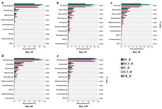 Differential analysis of bacterial composition under different seed-coating treatments at different time points: (a) day 10, (b) day 20, (c) day 30, (d) day 60, and (e) day 120. The vertical axis represents the names of species at the phylum level, while the horizontal axis indicates the percentage value of species abundance. The rightmost section displays the p-values, where * indicates 0.01 < p ≤ 0.05, and ** indicates 0.001 < p ≤ 0.01.