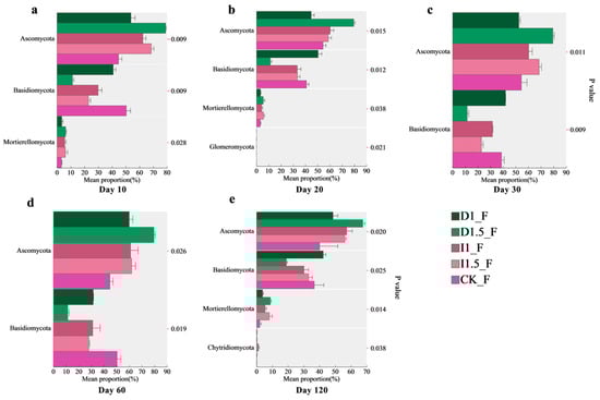 Differential analysis of fungal composition under different seed-coating treatments at different time points: (a) day 10, (b) day 20, (c) day 30, (d) day 60, and (e) day 120. The vertical axis represents the names of species at the phylum level, while the horizontal axis indicates the percentage value of species abundance. The rightmost section displays the p-values, where * indicates 0.01 < p ≤ 0.05, and ** indicates 0.001 < p ≤ 0.01.