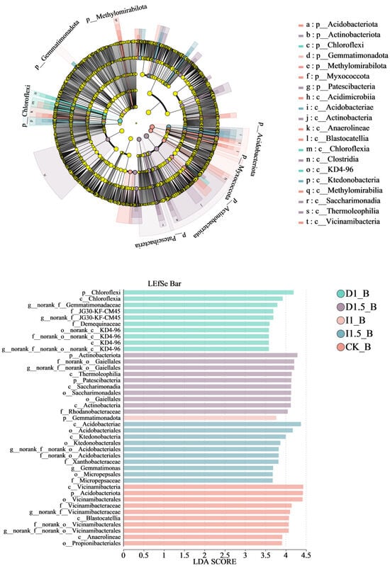 In total, 94 distinct bacterial species (Table S2, LDA > 3.5) were identified, with 12 enriched in the D1 treatment, 28 in the D1.5, 1 in the I1, 21 in the I1.5, and 32 in the CK control groups. Figure 8 displays the top 10 species ranked by LDA values for each group. Chloroflexi, Actinobacteriota, Gemmatimonadota, Acidobacteriota, and Vicinamibacteria were the most influential bacterial taxa in the D1, D1.5, I1, I1.5, and CK groups, respectively. Under identical analytical conditions (Figure 8, LDA > 3.5), rhizospheric bacterial species exhibited greater enrichment in the D1.5 treatment and CK control groups, with the enrichment order ranked as CK > D1.5 > I1.5 > D1 > I1.