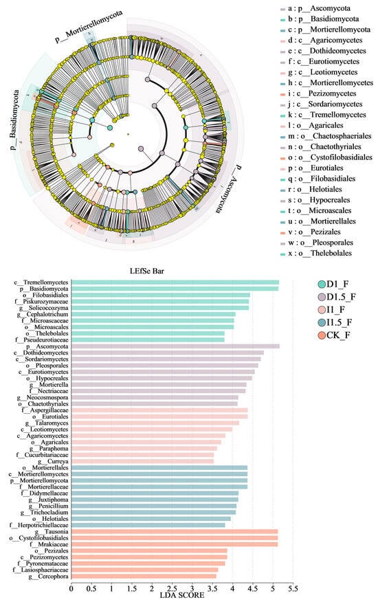 For fungi, 73 distinct species were identified (Table S3, LDA > 3.5), with 11 enriched in the D1, 27 in the D1.5, 11 in the I1, 15 in the I1.5, and 9 in the CK groups. Tremellomycetes, Ascomycota, Aspergillaceae, Mortierellomycetes, and Tausonia were the most influential fungal taxa in the D1, D1.5, I1, I1.5, and CK groups, respectively. Under the same analytical conditions (Figure 9, LDA > 3.5), rhizospheric fungal species showed greater enrichment in the D1.5 treatment and I1.5 control groups, ranked as D1.5 > I1.5 > D1 = I1 > CK. The control group (CK) exhibited significant enrichment of Lasiosphaeriaceae (family to genus), Pezizomycetes (class to family), and Cystofilobasidiales (order to genus). The standard difenoconazole group (D1) enriched Thelebolales (order to genus) and Cephalotrichum (genus). The elevated difenoconazole group (D1.5) showed notable enrichment of Dothideomycetes (class to order), Chaetomiaceae (family to genus), and Hypocreales (order to genus). The standard imidacloprid group (I1) enriched Paraphoma (genus) and Leotiomycetes (class), while the elevated imidacloprid group (I1.5) significantly enriched Juxtiphoma (family to genus), Trichocladium (genus), and other fungi.