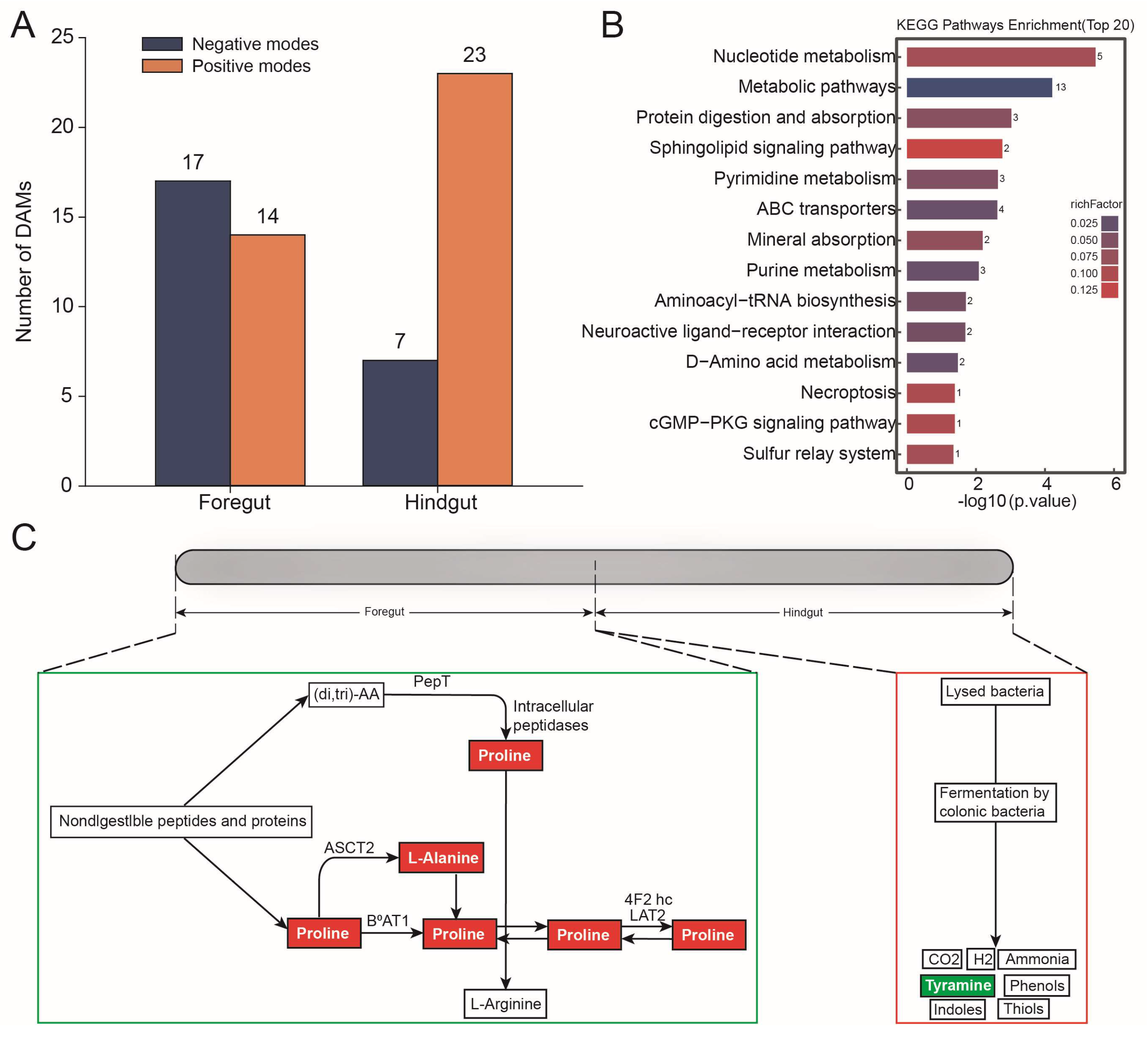In the foregut, 31 differential metabolites were significantly upregulated in abundance; in the hindgut, there were 30 differential metabolites that were significantly upregulated in abundance (OPLS-DA VIP > 1, p value < 0.05, and Fold change > 1 or Fold change < 1) (Figure 5A and Tables S5 and S6). The differential metabolites were found to be significantly enriched in the protein digestion and absorption pathway (Figure 5B). In this pathway, the abundance of alanine (Fold change = 0.696; p-value = 0.021; VIP = 2.437) and the abundance of proline (Fold change = 0.429; p-value = 0.038; VIP = 10.390) were significantly upregulated in the foregut based on the negative modes, and the abundance of tyramine (Fold change = 1.724; p-value = 0.013; VIP = 4.808) was significantly upregulated in the hindgut based on the positive modes (Figure 5C).
