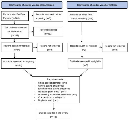 Table 2 summarizes the results from the 13 selected studies regarding carbapenemase types, sources, species, plasmids, and MGEs involved. As evidenced by the presence of a similar plasmid backbone and/or the same MGE in various species retrieved from clinical/environmental sources, HGTs were present in all 13 selected studies.
